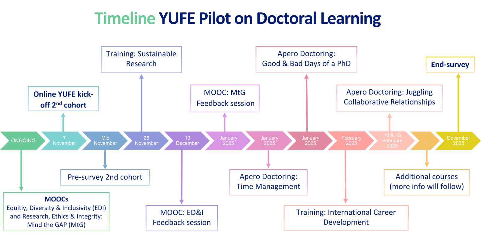 The YUFE Pilot on Doctoral Learning started with a YUFE-wide kick-off across all partaking YUFE institutions on May 7th, 2024. A second YUFE wide kick-off for the second cohort will be organised on November 7th 2024. Evaluation of the pilot will take place in December 2025.