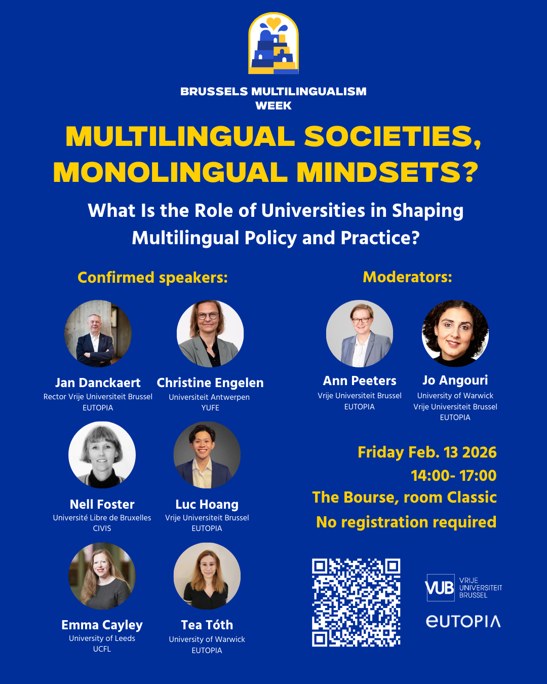 Participants: Ann Peeters (Vrije Universiteit Brussel, EUTOPIA), Jo Angouri (University of Warwick, VUB, EUTOPIA), Jan Danckaert (Rector Vrije Universiteit Brussel, EUTOPIA), Christine Engelen (Universiteit Antwerpen, YUFE), Nell Foster (Université Libre de Bruxelles, CIVIS), Luc Hoang (Vrije Universiteit Brussel, EUTOPIA), Emma Cayley (University of Leeds, UCFL), Tea Toth (Universite of Warwick, EUTOPIA)